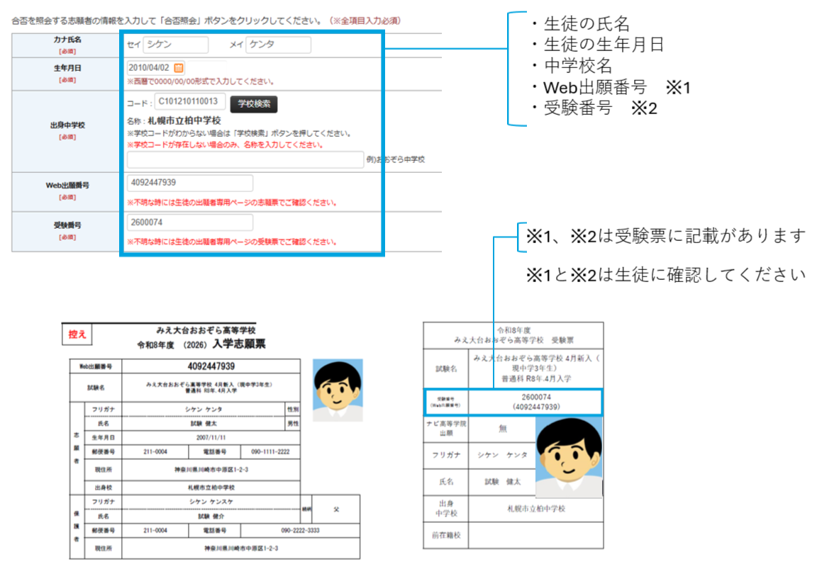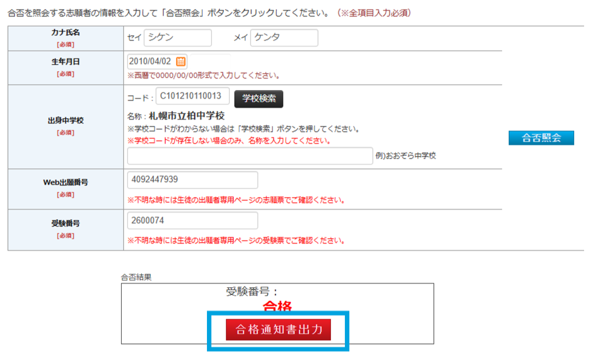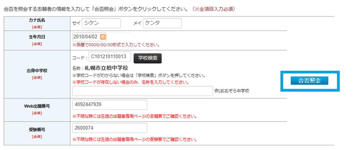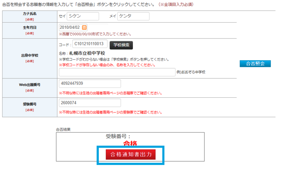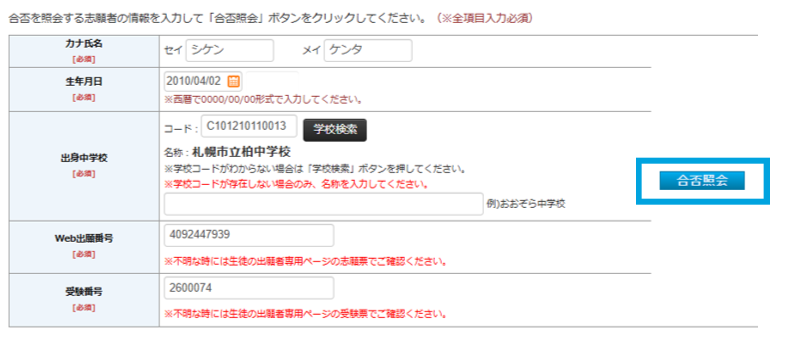 「合否照会」を押してください。画面の下に合否結果が出ます。