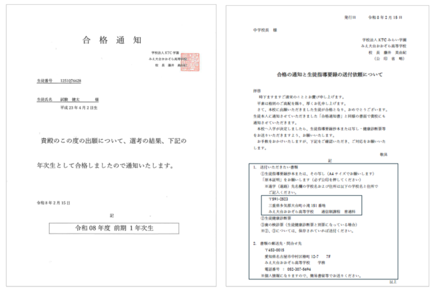 合格通知書と生徒指導要録の送付依頼についてを出力してください。